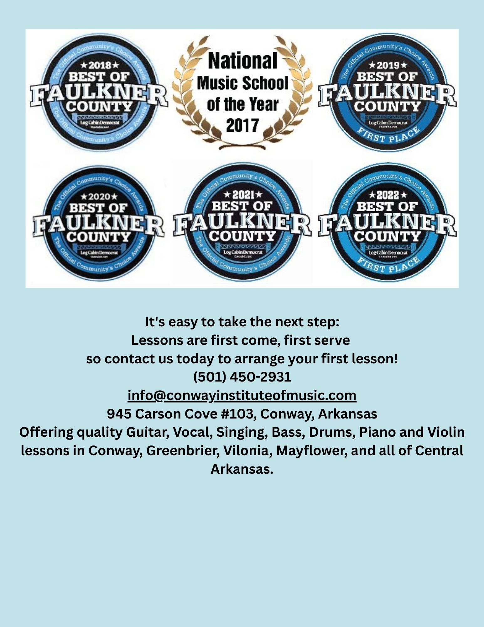 Offering quality Guitar, Vocal, Singing, Bass, Drums, Piano and Violin lessons in Conway, Greenbrier, Vilonia, Mayflower, and all of Central Arkansas.